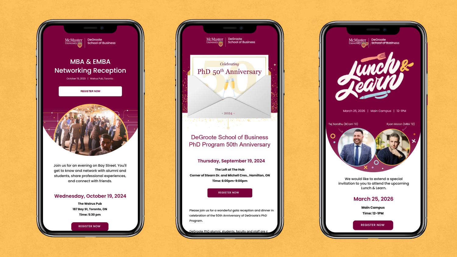 I designed a clean, minimalist layout with bold visuals and simplified structures, ensuring that it is flexible and easy to adapt within the limitations of Dynamics. The user-friendly templates come with clear instructions and feedback loops, emphasizing skimmable content. This approach has led to higher engagement, increased event RSVPs, and improved team satisfaction, fostering a stronger sense of pride within the DeGroote community.